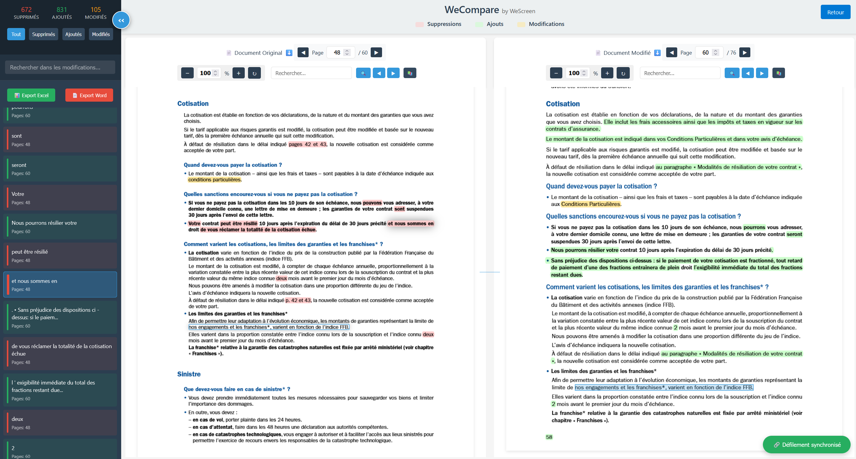 Interface intuitive avec navigation synchronisée entre les documents. Visualisez les différences en un coup d'œil avec notre système de mise en évidence intelligent.