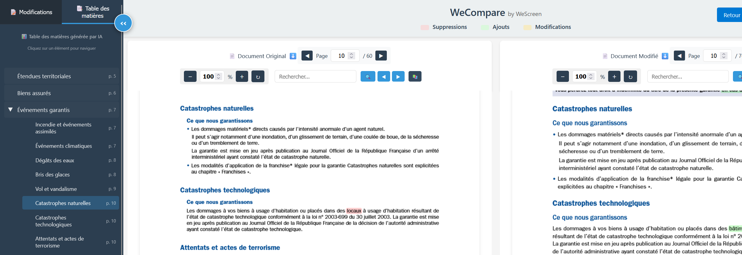 Notre IA analyse vos documents et génère automatiquement un sommaire structuré des principales différences détectées, vous permettant de comprendre l'essentiel en un coup d'œil.